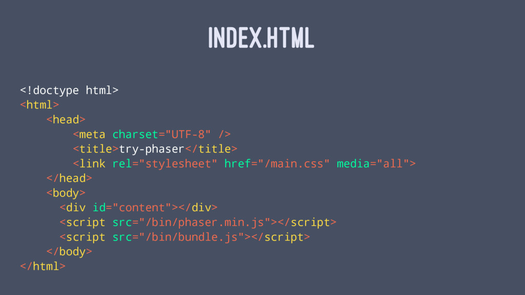 rel="stylesheet" href="/main.css" media="all"> </head> <body> <div id="content"></div> <script src="/bin/phaser.min.js"></script> <script src="/bin/bundle.js"></script> </body> </html>