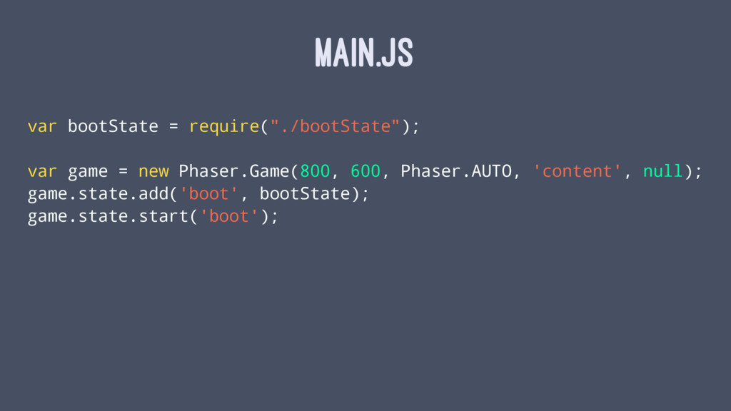 MAIN.JS var bootState = require("./bootState"); var game = new Phaser.Game(800,