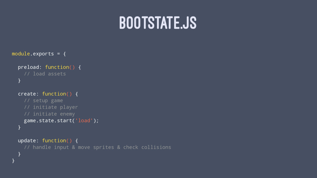 BOOTSTATE.JS module.exports = { preload: function() { // load assets