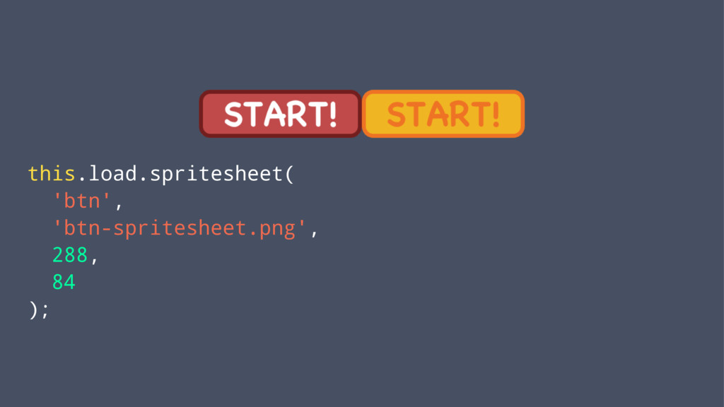 this.load.spritesheet( 'btn', 'btn-spritesheet.png', 288, 84 );