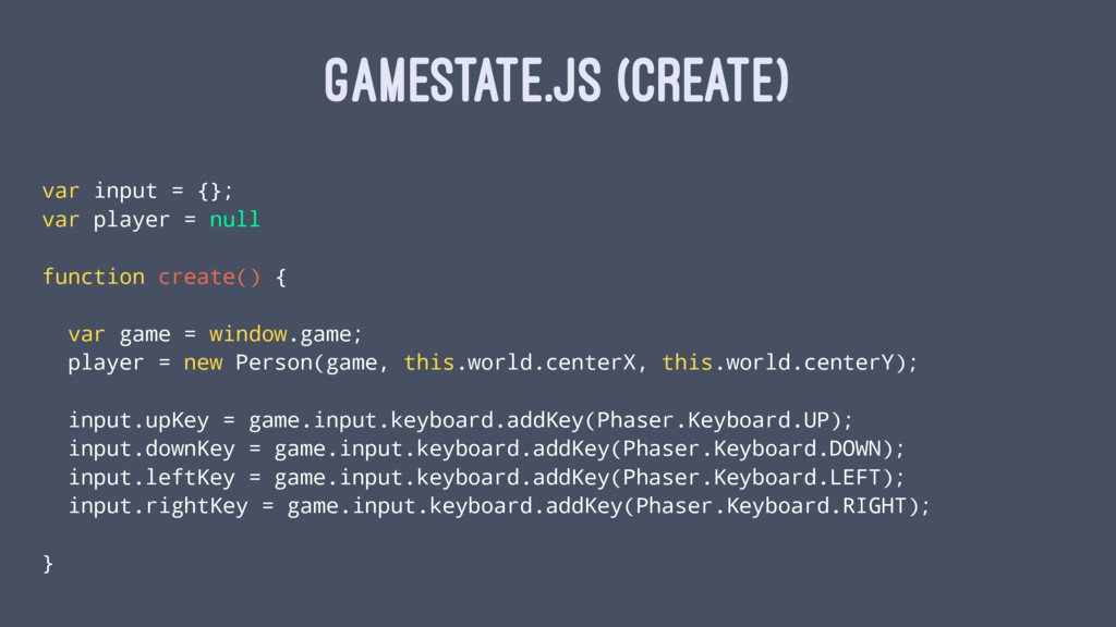 GAMESTATE.JS (CREATE) var input = {}; var player = null