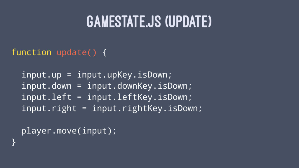 GAMESTATE.JS (UPDATE) function update() { input.up = input.upKey.isDown; input.down =