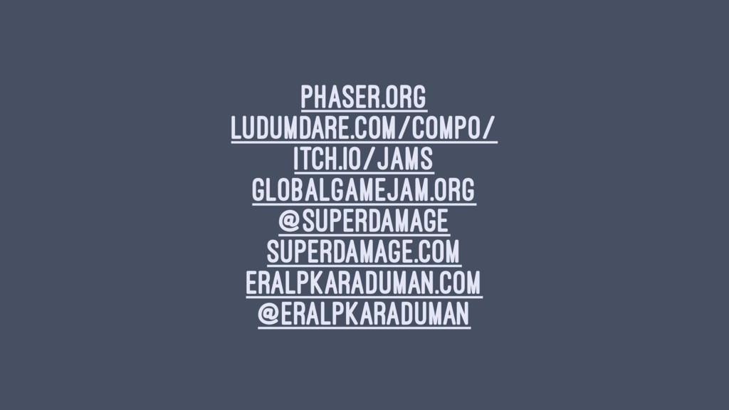 phaser.org ludumdare.com/compo/ itch.io/jams globalgamejam.org @superdamage superdamage.com eralpkaraduman.com @eralpkaraduman
