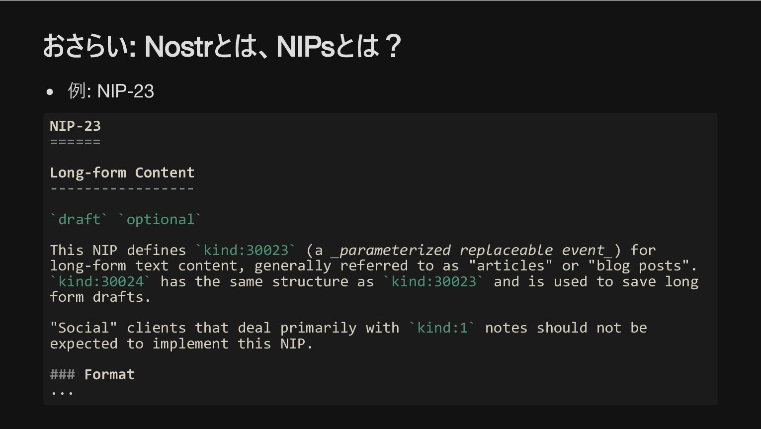 `optional` This NIP defines `kind:30023` (a _parameterized replaceable event_) for long-form text content, generally referred to as "articles" or "blog posts". `kind:30024` has the same structure as `kind:30023` and is used to save long form drafts. "Social" clients that deal primarily with `kind:1` notes should not be expected to implement this NIP. ### Format ...