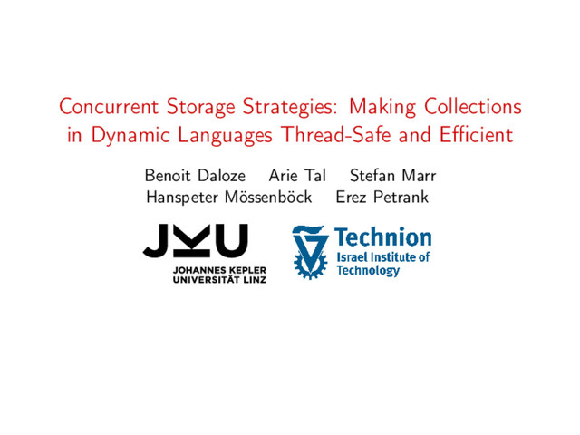 Built-in collections in dynamic programming languages are either inefficient or thread-unsafe. In this talk, I will show an approach to make the two built-in collections in Ruby (Array and Hash) both as efficient as unsynchronized implementations and yet thread-safe as if they were always synchronized. Moreover, we show that common operations on these collections can scale to many cores.