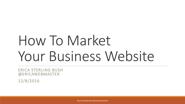 Websites www.ericasterlingbush.com www.tekniquellc.com For Copies of presentation: https://speakerdeck.com/ericawebmaster/ho w-to-market-your-website ERICA STERLING BUSH @ERICAWEBMASTER