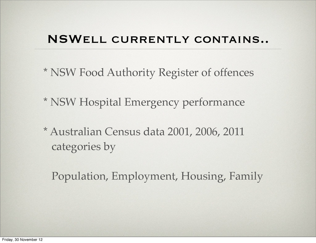 of sources in many different formats. It’s a big ask for an average Australian to visit these sites and digest the data meaningfully. Friday, 30 November 12