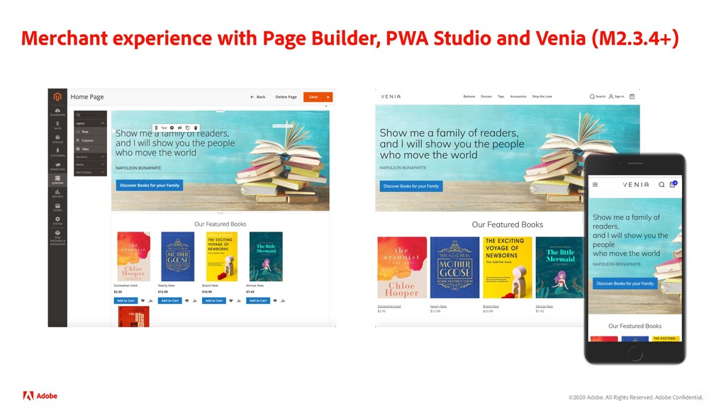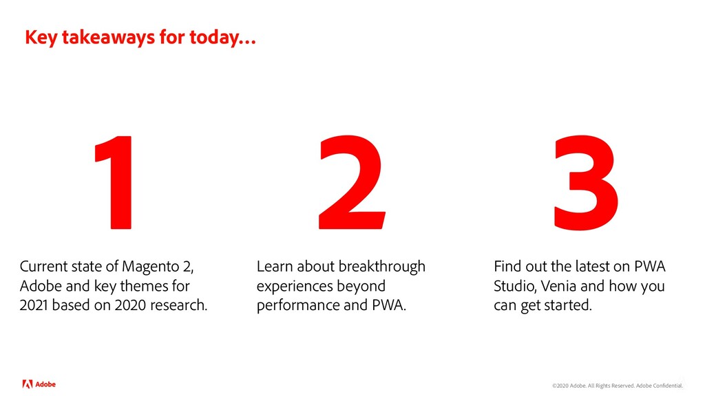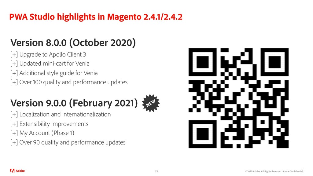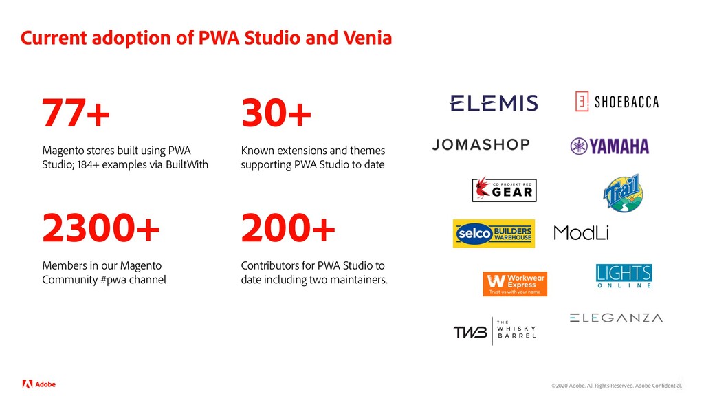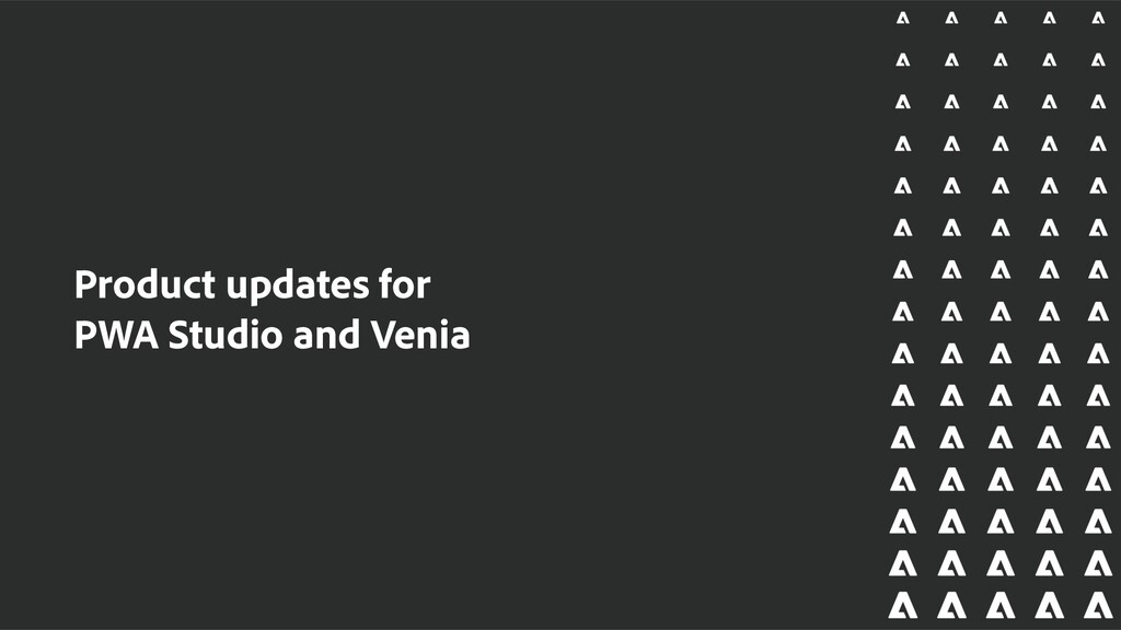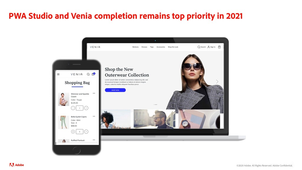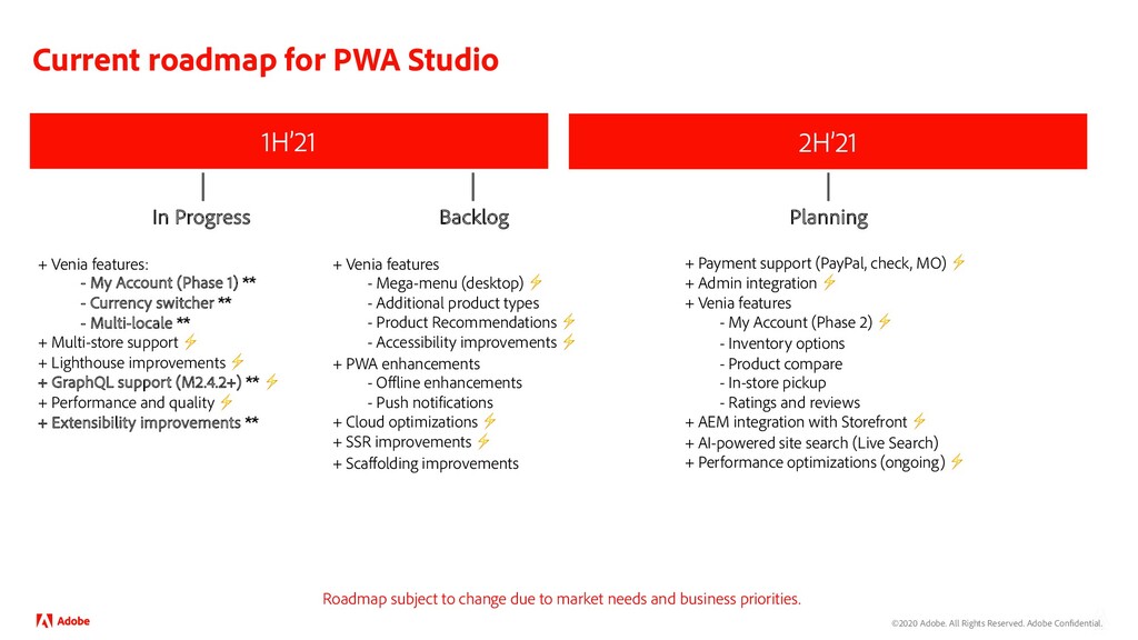 PWA Studio + Payment support (PayPal, check, MO) ⚡ + Admin integration ⚡ + Venia features - My Account (Phase 2) ⚡ - Inventory options - Product compare - In-store pickup - Ratings and reviews + AEM integration with Storefront ⚡ + AI-powered site search (Live Search) + Performance optimizations (ongoing) ⚡ 1H’21 + Venia features: - My Account (Phase 1) ** - Currency switcher ** - Multi-locale ** + Multi-store support ⚡ + Lighthouse improvements ⚡ + GraphQL support (M2.4.2+) ** ⚡ + Performance and quality ⚡ + Extensibility improvements ** Roadmap subject to change due to market needs and business priorities. In Progress Backlog Planning + Venia features - Mega-menu (desktop) ⚡ - Additional product types - Product Recommendations ⚡ - Accessibility improvements ⚡ + PWA enhancements - Offline enhancements - Push notifications + Cloud optimizations ⚡ + SSR improvements ⚡ + Scaffolding improvements 2H’21