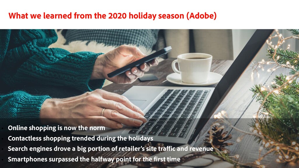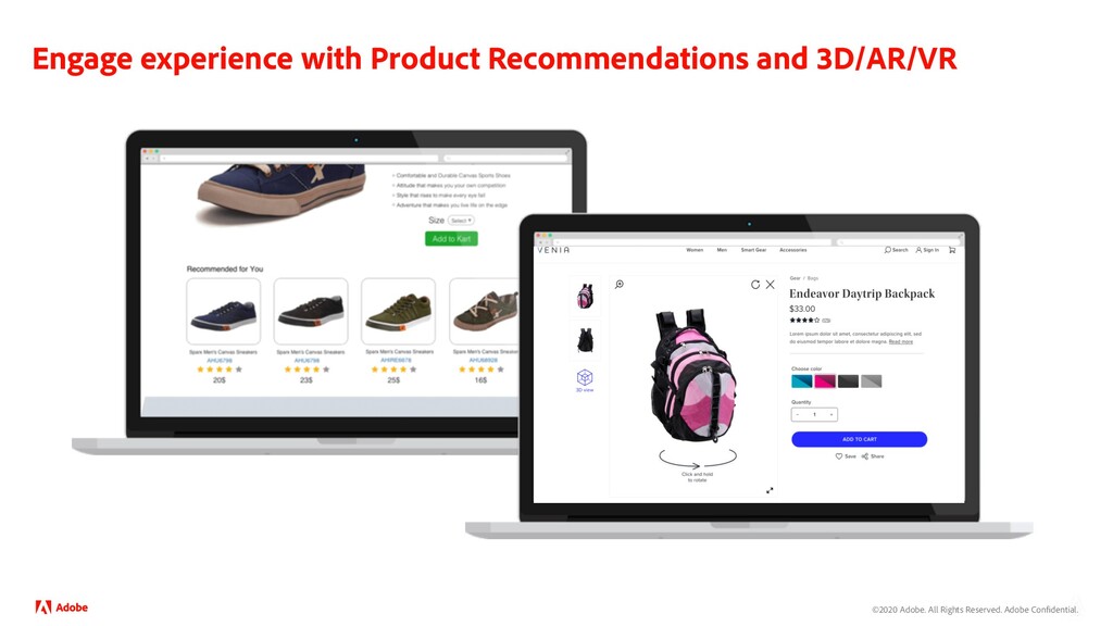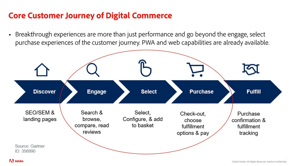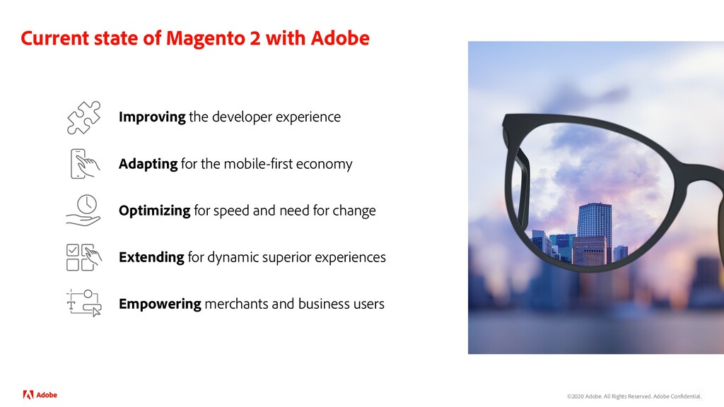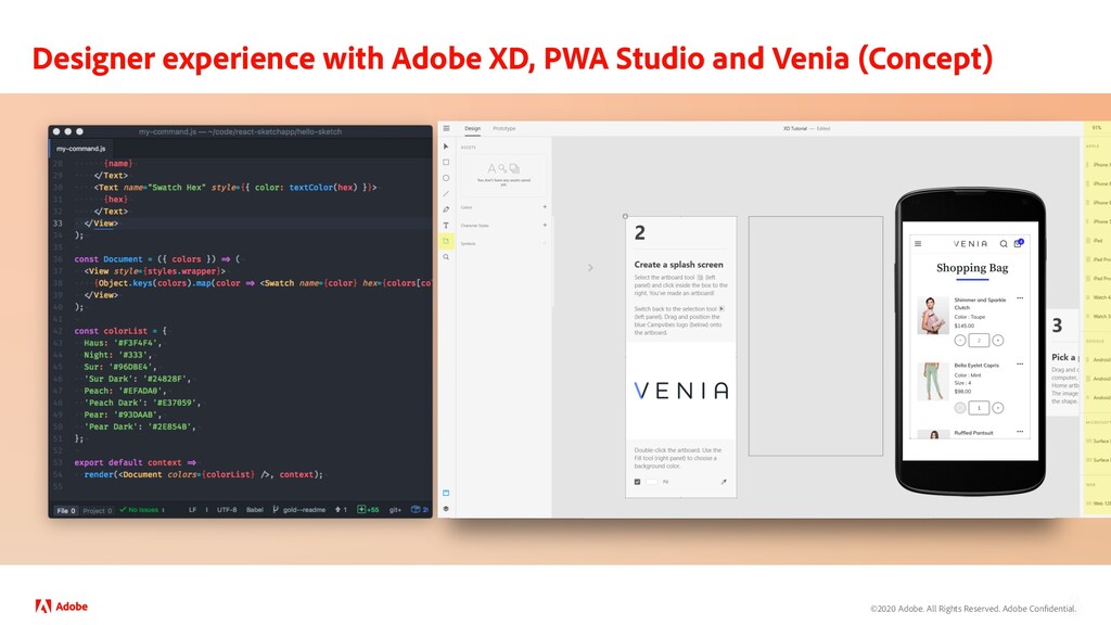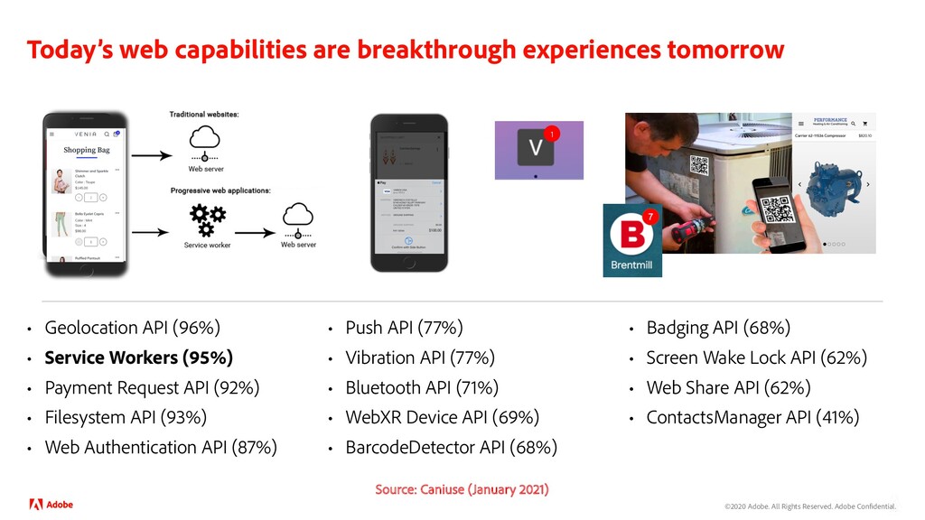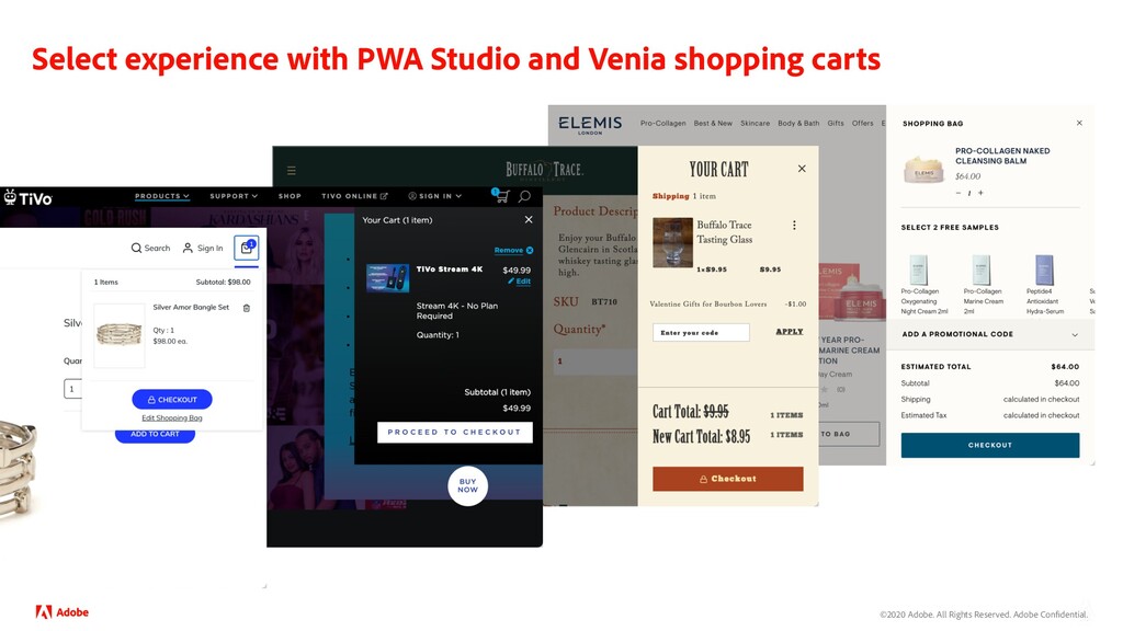 PWA Studio + Payment support (PayPal, check, MO) ⚡ + Admin integration ⚡ + Venia features - My Account (Phase 2) ⚡ - Inventory options - Product compare - In-store pickup - Ratings and reviews + AEM integration with Storefront ⚡ + AI-powered site search (Live Search) + Performance optimizations (ongoing) ⚡ 1H’21 + Venia features: - My Account (Phase 1) ** - Currency switcher ** - Multi-locale ** + Multi-store support ⚡ + Lighthouse improvements ⚡ + GraphQL support (M2.4.2+) ** ⚡ + Performance and quality ⚡ + Extensibility improvements ** Roadmap subject to change due to market needs and business priorities. In Progress Backlog Planning + Venia features - Mega-menu (desktop) ⚡ - Additional product types - Product Recommendations ⚡ - Accessibility improvements ⚡ + PWA enhancements - Offline enhancements - Push notifications + Cloud optimizations ⚡ + SSR improvements ⚡ + Scaffolding improvements 2H’21