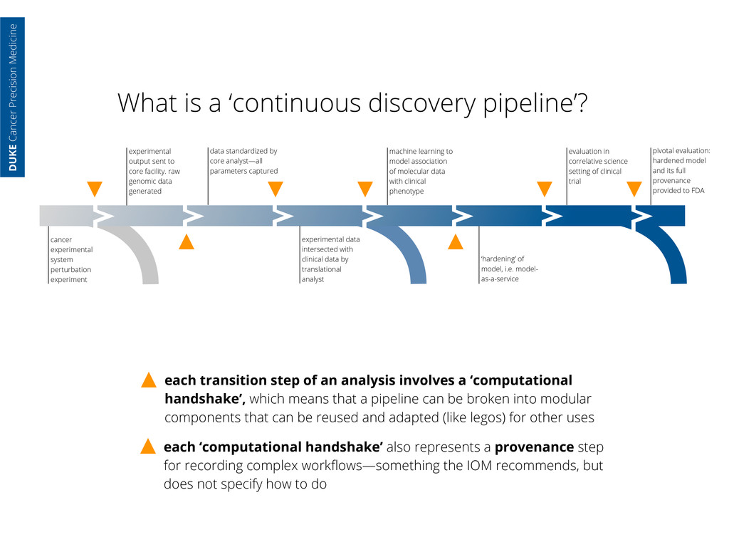 of Sciences. All rights reserved. This summary plus thousands more available at http://www.nap.edu mittee envisions these data repositories as essential infrastructure, necessary both for creating the New Taxonomy and, more broadly, for integrating basic biological knowledge with medical histories and health outcomes of individual patients. The Committee believes that building this infrastructure—the Infor- mation Commons and Knowledge Network—is a grand challenge that, if met, would both modernize the ways in which biomedical research is conducted and, over time, lead to dramatically improved patient care (see Figure S-1). The Committee envisions this ambitious program, which would play out on a time scale of decades rather than years, as proceeding through a blend of top-down and bottom-up activity. A major top-down component, initiated by public and private agencies that fund and regulate biomedical research, would be required to ensure that results of individual projects could be combined to Figure S-1, 1-3 Bitmapped FIGURE S-1 Creation of a New Taxonomy first requires an “Information Commons” in which data on large populations of patients become broadly available for research use and a “Knowledge Network” that adds value to these data by highlighting their inter-connectedness and integrating them with evolving knowledge of fundamental biological processes. SOURCE: Committee on A Framework for Developing a New Taxonomy of Disease. multiple layers of ‘omic and clinical data provide inference that provide data-driven taxonomic disease classes facilitating more precise care delivery more data for refining disease models and kickstart a virtuous cycle for integrating basic research more rapidly into actionable insights DUKE Cancer Precision Medicine