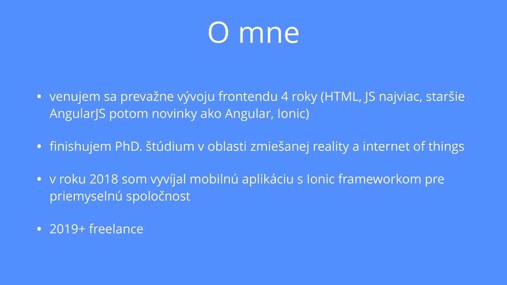 (HTML, JS najviac, staršie AngularJS potom novinky ako Angular, Ionic) • finishujem PhD. štúdium v oblasti zmiešanej reality a internet of things • v roku 2018 som vyvíjal mobilnú aplikáciu s Ionic frameworkom pre priemyselnú spoločnost • 2019+ freelance