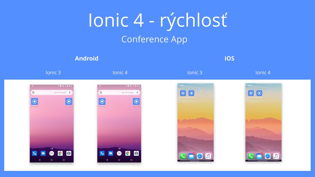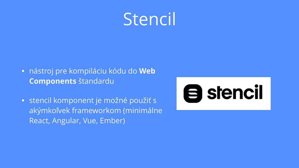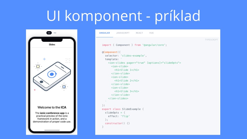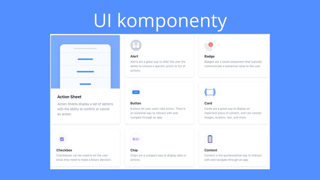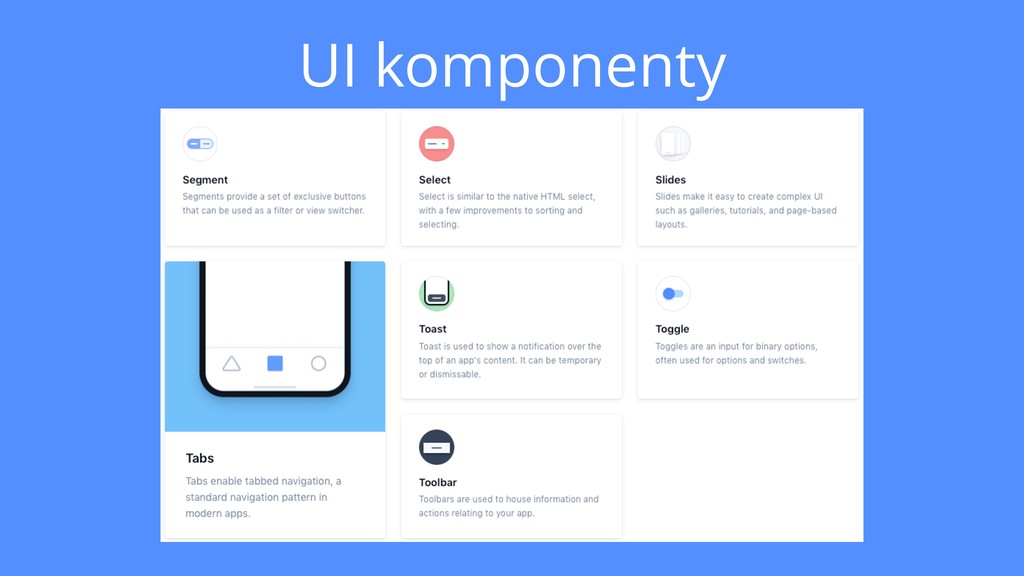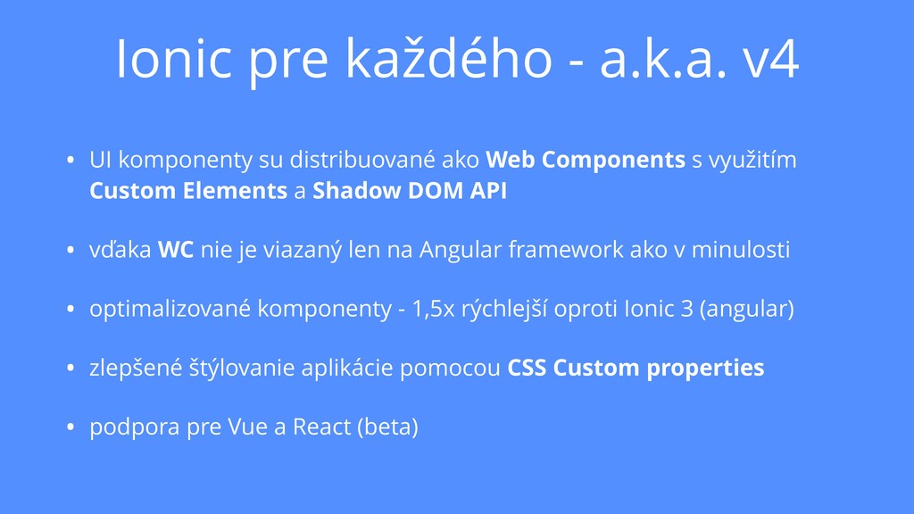 distribuované ako Web Components s využitím Custom Elements a Shadow DOM API • vďaka WC nie je viazaný len na Angular framework ako v minulosti • optimalizované komponenty - 1,5x rýchlejší oproti Ionic 3 (angular) • zlepšené štýlovanie aplikácie pomocou CSS Custom properties • podpora pre Vue a React (beta)