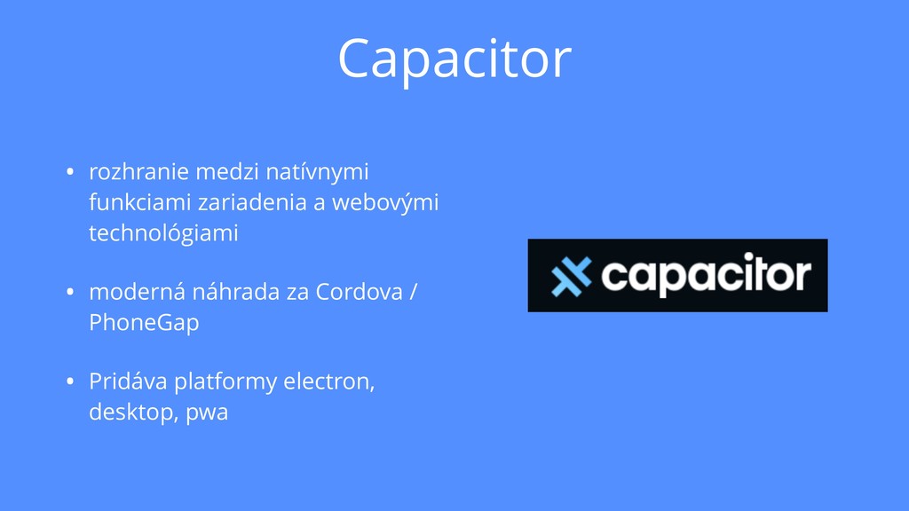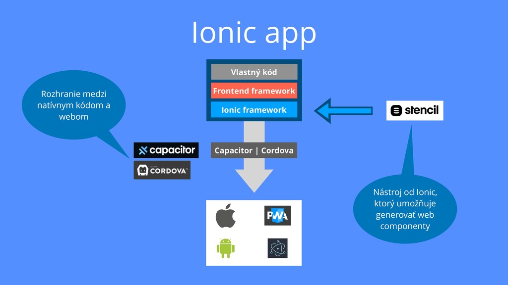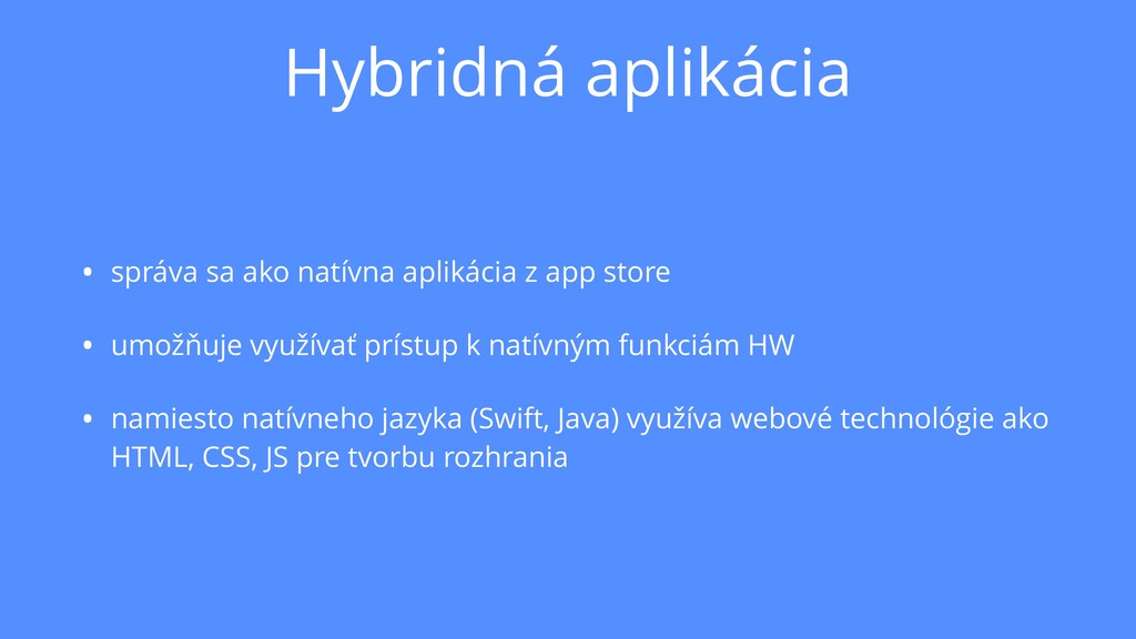 store • umožňuje využívať prístup k natívným funkciám HW • namiesto natívneho jazyka (Swift, Java) využíva webové technológie ako HTML, CSS, JS pre tvorbu rozhrania