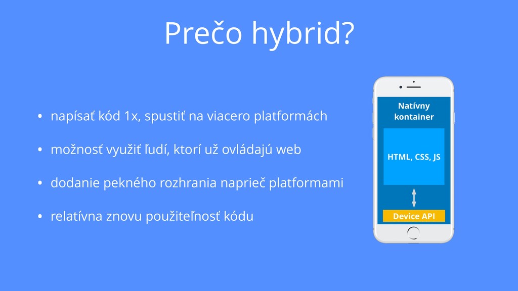 • možnosť využiť ľudí, ktorí už ovládajú web • dodanie pekného rozhrania naprieč platformami • relatívna znovu použiteľnosť kódu Natívny kontainer Device API HTML, CSS, JS