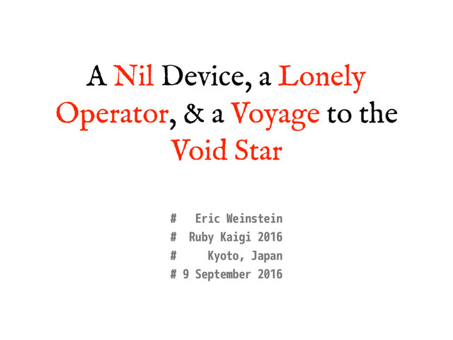 it for? • A Lonely Operator: &. in Ruby 2.3 (and how other languages handle their versions of nil) • A Voyage to the Void Star: A history of nothingness • Summary and takeaways • Questions!