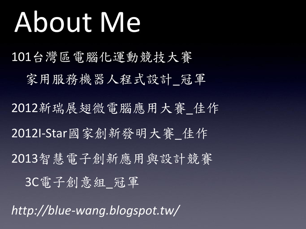 About Me 101台灣區電腦化運動競技大賽 家用服務機器人程式設計_冠軍 2012新瑞展翅微電腦應用大賽_佳作 2012I-Star國家創新發明大賽_佳作 2013智慧電子創新應用與設計競賽 3C電子創意組_冠軍 http://blue-wang.blogspot.tw/