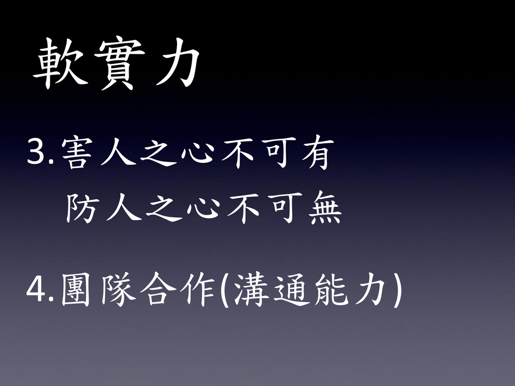 3.害人之心不可有 防人之心不可無 軟實力 4.團隊合作(溝通能力)