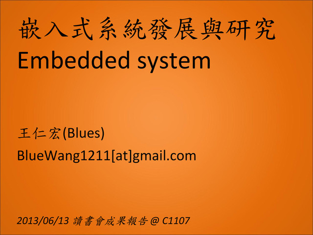 嵌入式系統發展與研究 Embedded system 2013/06/13 讀書會成果報告 @ C1107 王仁宏(Blues) BlueWang1211[at]gmail.com