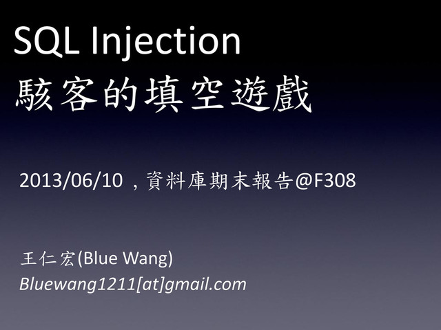SQL Injection 駭客的填空遊戲 2013/06/10 ,資料庫期末報告@F308 王仁宏(Blue Wang) Bluewang1211[at]gmail.com