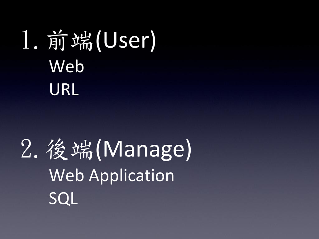 1.前端(User) Web URL 2.後端(Manage) Web Application SQL