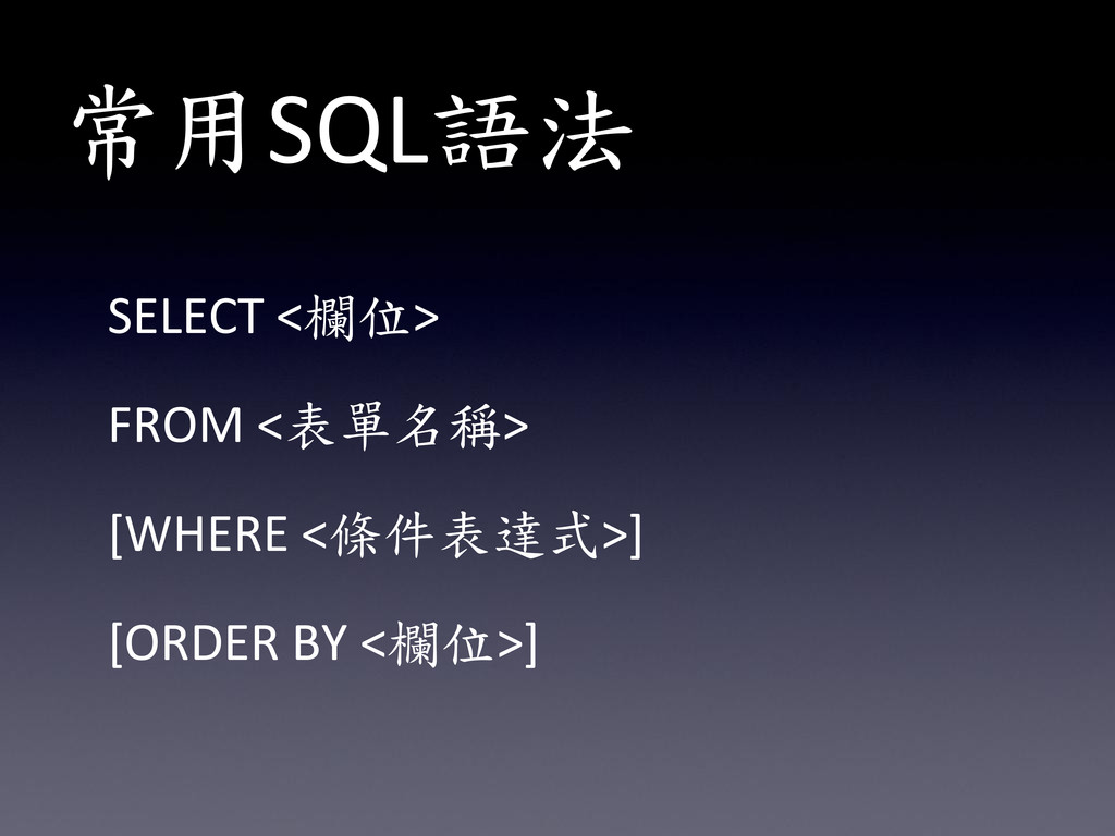 SELECT <欄位> FROM <表單名稱> [WHERE <條件表達式>] [ORDER BY <欄位>] 常用SQL語法