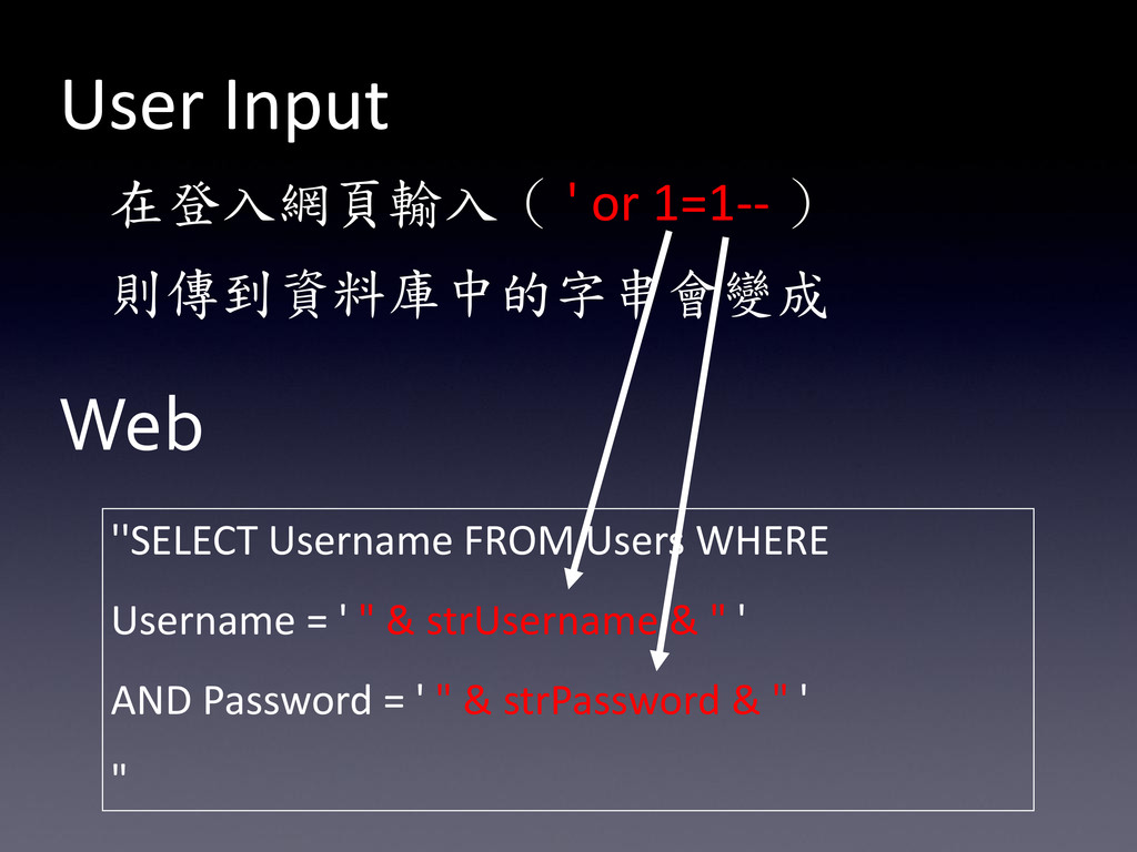 在登入網頁輸入( ' or 1=1-- ) 則傳到資料庫中的字串會變成 User Input Web ''SELECT