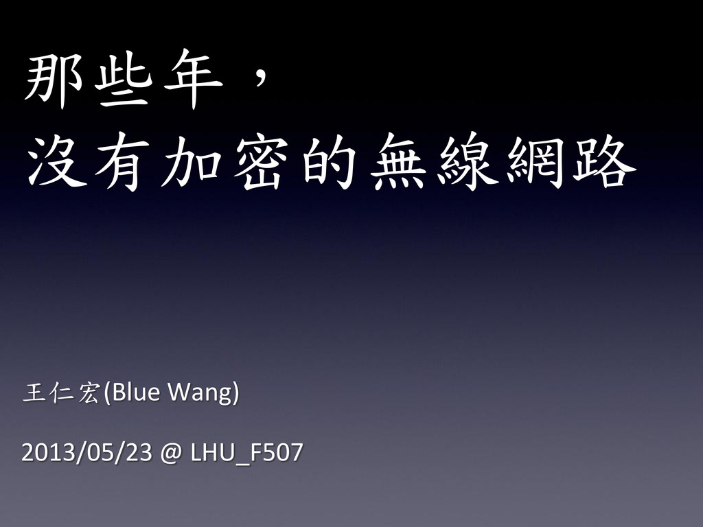 那些年, 沒有加密的無線網路 王仁宏(Blue Wang) 2013/05/23 @ LHU_F507