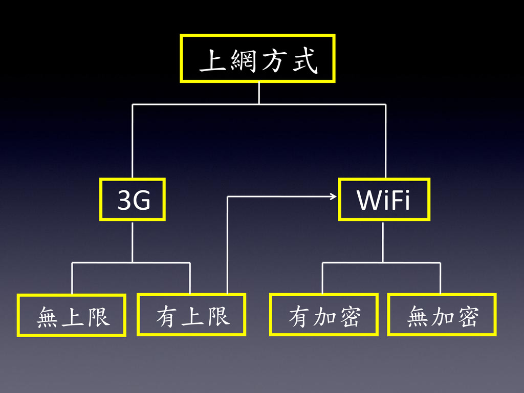上網方式 3G WiFi 無上限 有上限 有加密 無加密