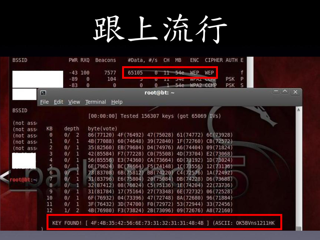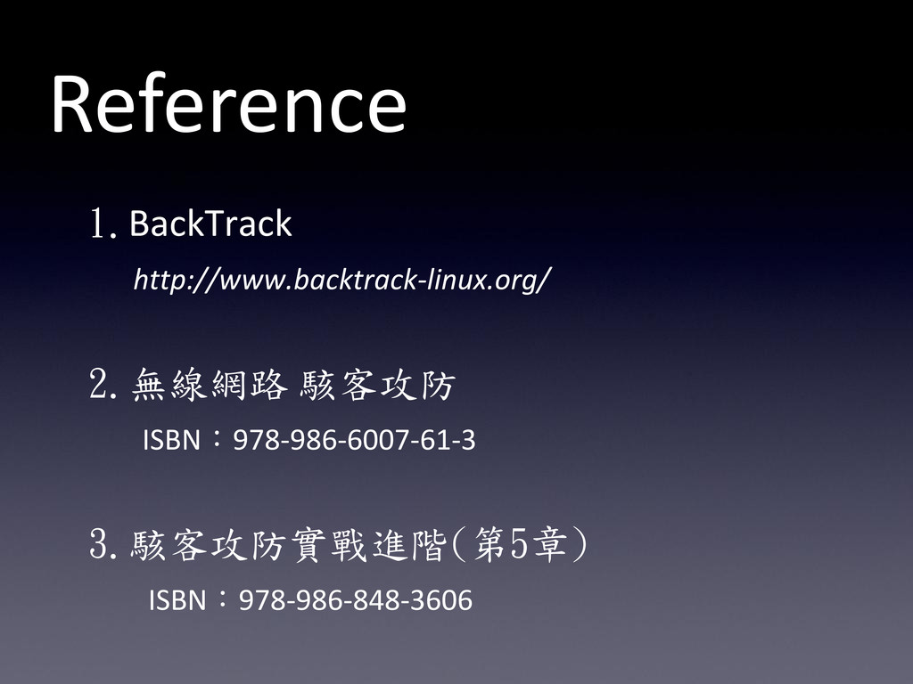 1.BackTrack http://www.backtrack-linux.org/ 2.無線網路 駭客攻防 ISBN:978-986-6007-61-3 3.駭客攻防實戰進階(第5章) ISBN:978-986-848-3606 Reference