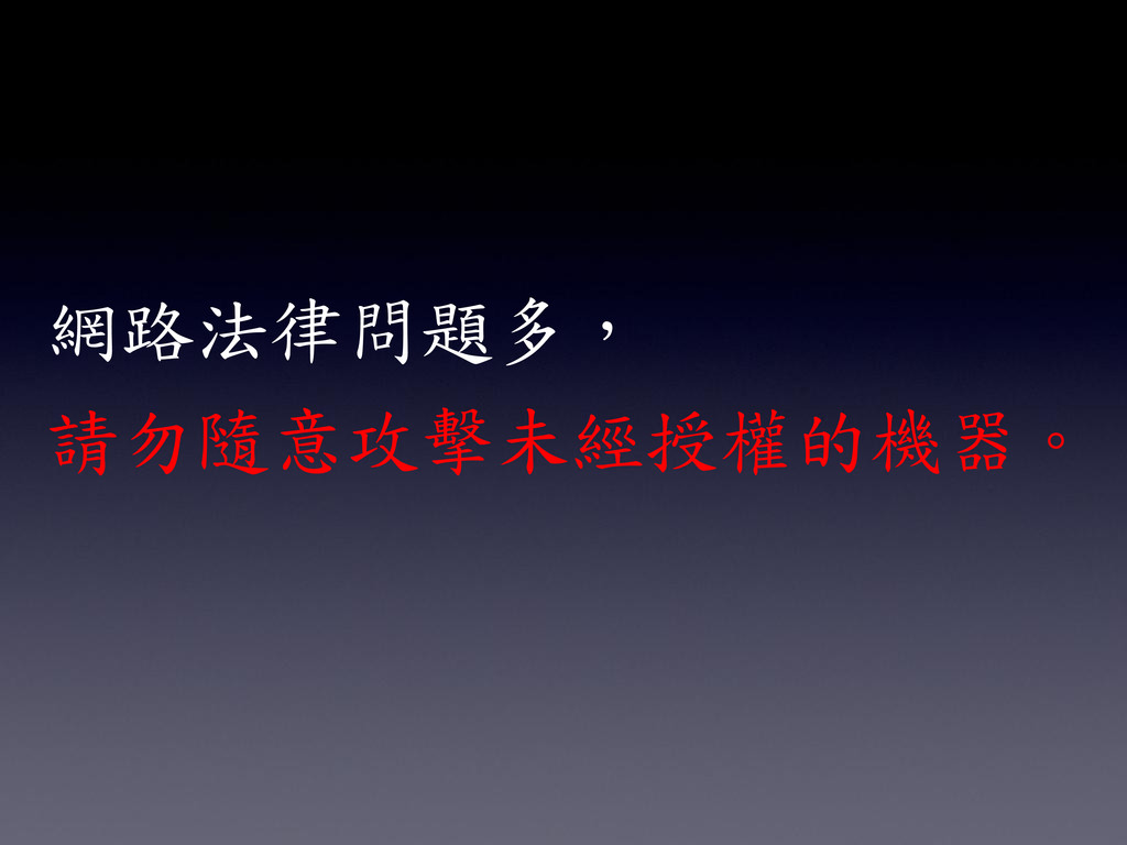網路法律問題多, 請勿隨意攻擊未經授權的機器。