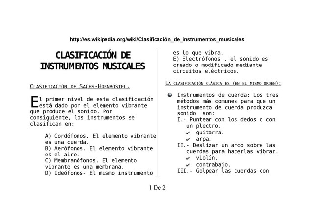 nivel de esta clasificación está dado por el elemento vibrante que produce el sonido. Por consiguiente, los instrumentos se clasifican en: E A) Cordófonos. El elemento vibrante es una cuerda. B) Aerófonos. El elemento vibrante es el aire. C) Membranófonos. El elemento vibrante es una membrana. D) Ideófonos- El mismo instrumento es lo que vibra. E) Electrófonos . el sonido es creado o modificado mediante circuitos eléctricos. LA CLASIFICACIÓN CLÁSICA ES (EN EL MISMO ORDEN): Instrumentos de cuerda: Los tres métodos más comunes para que un instrumento de cuerda produzca sonido son: I.- Puntear con los dedos o con un plectro. ✔ guitarra. ✔ arpa. II.- Deslizar un arco sobre las cuerdas para hacerlas vibrar. ✔ violín. ✔ contrabajo. III.- Golpear las cuerdas con 1 De 2