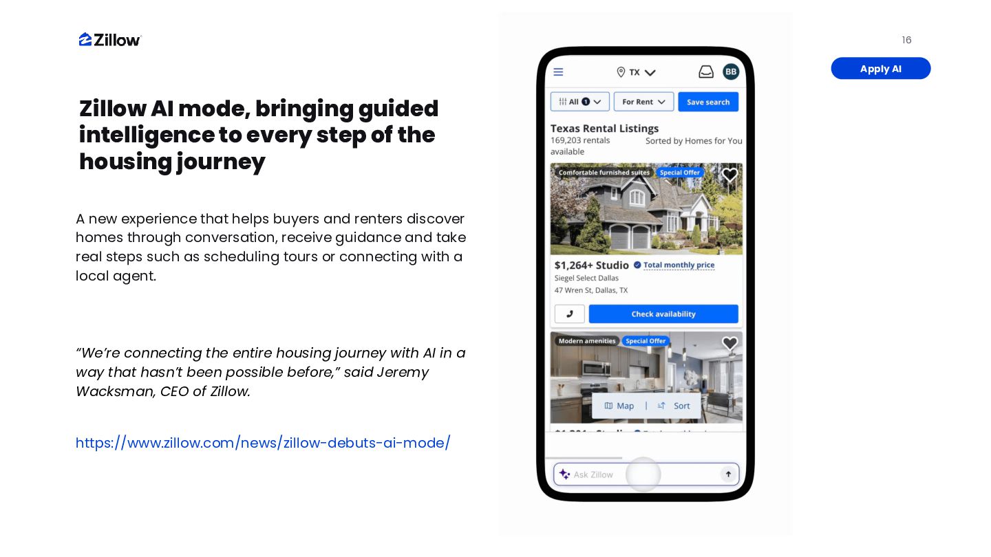 homes through conversation, receive guidance and take real steps such as scheduling tours or connecting with a local agent. “We’re connecting the entire housing journey with AI in a way that hasn’t been possible before,” said Jeremy Wacksman, CEO of Zillow. https://www.zillow.com/news/zillow-debuts-ai-mode/ Zillow AI mode, bringing guided intelligence to every step of the housing journey Apply AI