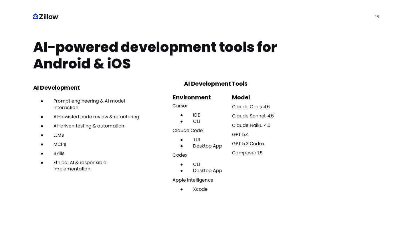 code review & refactoring • AI-driven testing & automation • LLMs • MCPs • Skills • Ethical AI & responsible implementation AI Development AI-powered development tools for Android & iOS AI Development Tools Claude Opus 4.6 Claude Sonnet 4.6 Claude Haiku 4.5 GPT 5.4 GPT 5.3 Codex Composer 1.5 Model Cursor • IDE • CLI Claude Code • TUI • Desktop App Codex • CLI • Desktop App Apple Intelligence • Xcode Environment