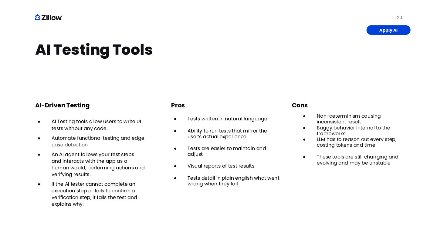 allow users to write UI tests without any code. • Automate functional testing and edge case detection • An AI agent follows your test steps and interacts with the app as a human would, performing actions and verifying results. • If the AI tester cannot complete an execution step or fails to confirm a verification step, it fails the test and explains why. Pros Cons • Tests written in natural language • Ability to run tests that mirror the user’s actual experience • Tests are easier to maintain and adjust • Visual reports of test results • Tests detail in plain english what went wrong when they fail • Non-determinism causing inconsistent result • Buggy behavior internal to the frameworks • LLM has to reason out every step, costing tokens and time • These tools are still changing and evolving and may be unstable Apply AI