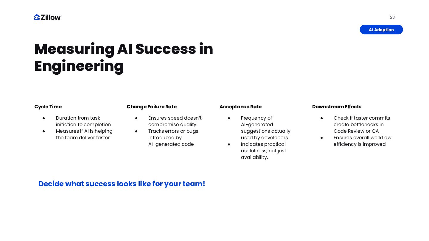 if AI is helping the team deliver faster Cycle Time Change Failure Rate Measuring AI Success in Engineering Acceptance Rate • Check if faster commits create bottlenecks in Code Review or QA • Ensures overall workflow efficiency is improved • Ensures speed doesn’t compromise quality • Tracks errors or bugs introduced by AI-generated code • Frequency of AI-generated suggestions actually used by developers • Indicates practical usefulness, not just availability. Downstream Effects AI Adoption Decide what success looks like for your team!