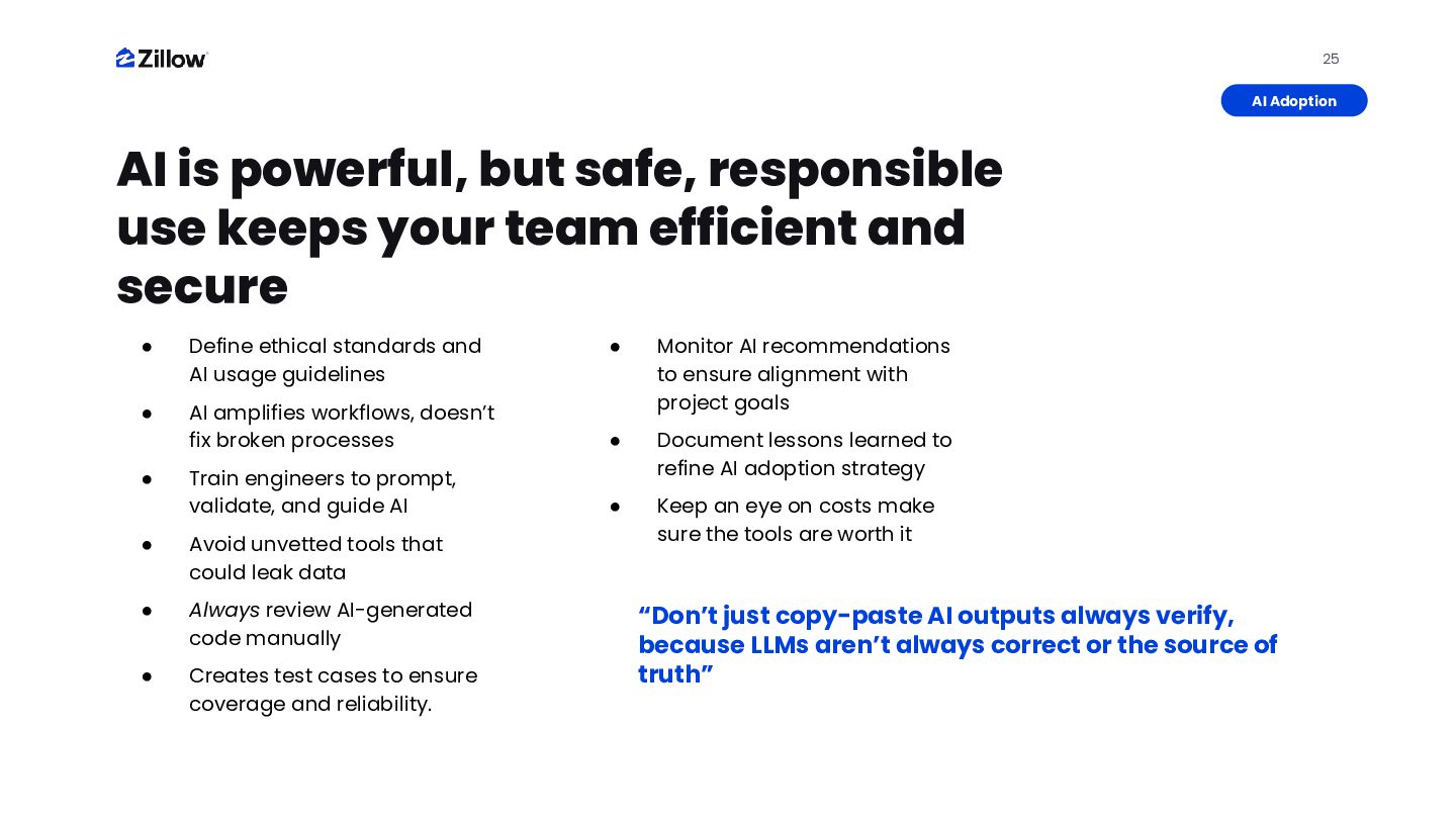 team efficient and secure • Define ethical standards and AI usage guidelines • AI amplifies workflows, doesn’t fix broken processes • Train engineers to prompt, validate, and guide AI • Avoid unvetted tools that could leak data • Always review AI-generated code manually • Creates test cases to ensure coverage and reliability. AI Adoption • Monitor AI recommendations to ensure alignment with project goals • Document lessons learned to refine AI adoption strategy • Keep an eye on costs make sure the tools are worth it “Don’t just copy-paste AI outputs always verify, because LLMs aren’t always correct or the source of truth”