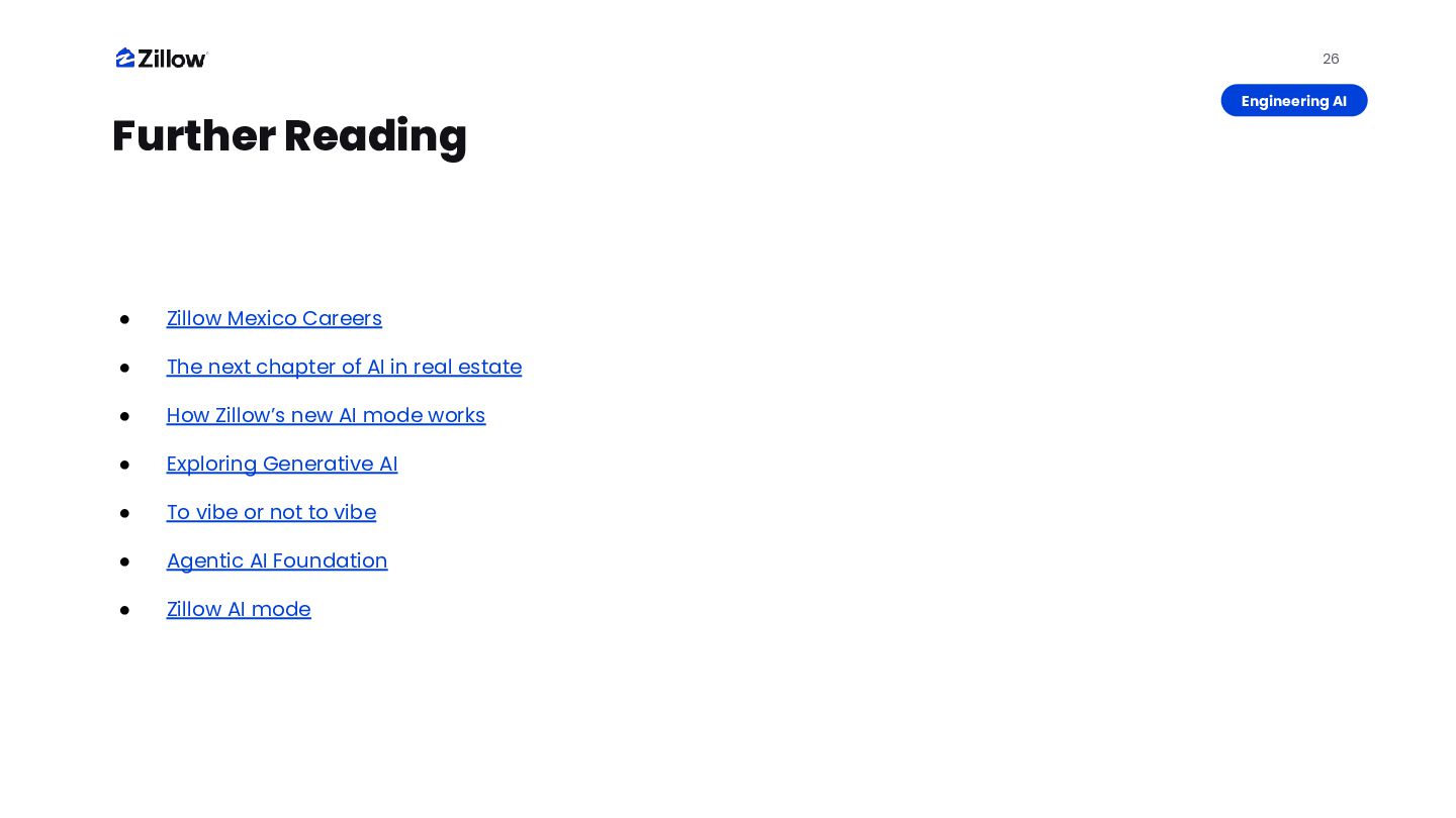 chapter of AI in real estate • How Zillow’s new AI mode works • Exploring Generative AI • To vibe or not to vibe • Agentic AI Foundation • Zillow AI mode Engineering AI