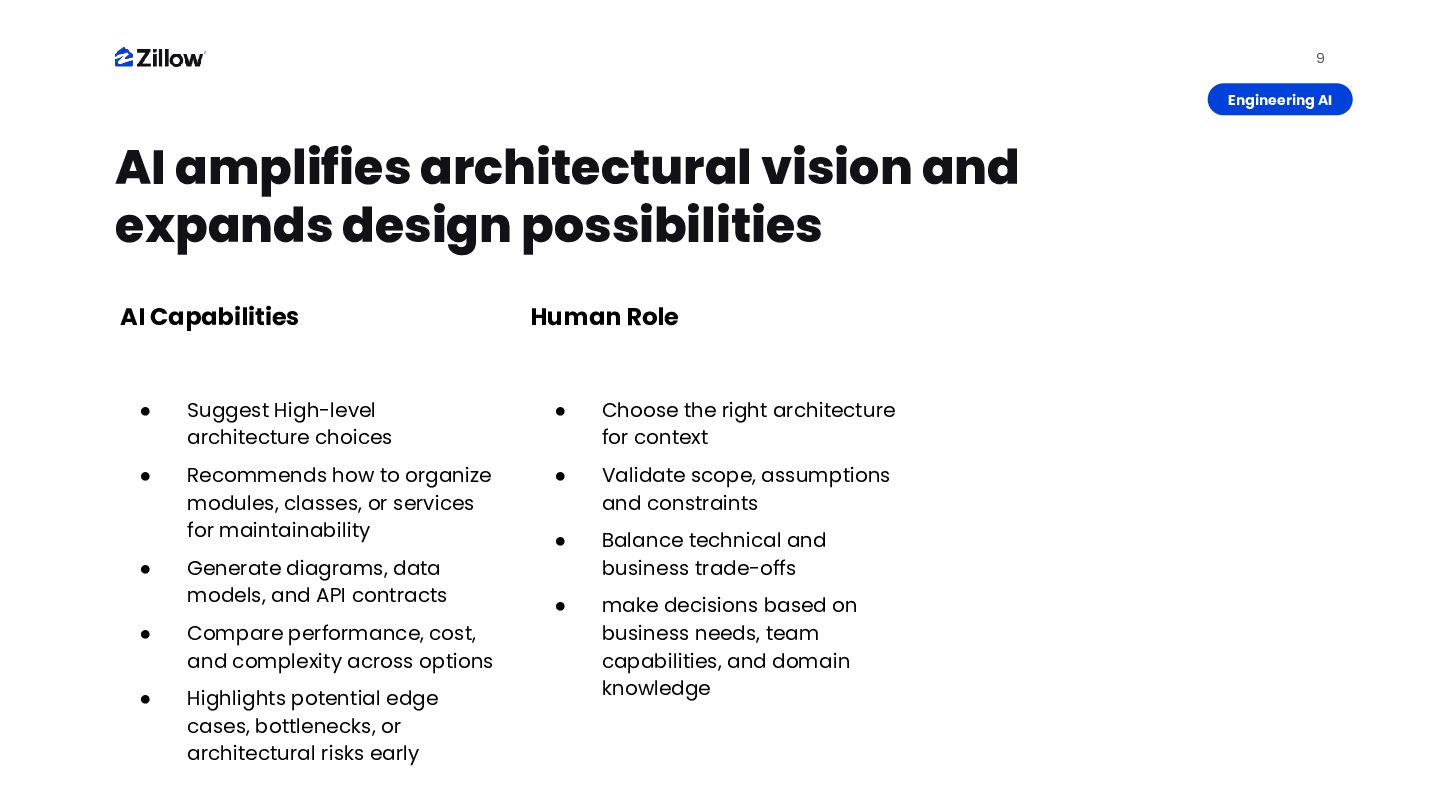 Suggest High-level architecture choices • Recommends how to organize modules, classes, or services for maintainability • Generate diagrams, data models, and API contracts • Compare performance, cost, and complexity across options • Highlights potential edge cases, bottlenecks, or architectural risks early AI Capabilities • Choose the right architecture for context • Validate scope, assumptions and constraints • Balance technical and business trade-offs • make decisions based on business needs, team capabilities, and domain knowledge Human Role Engineering AI