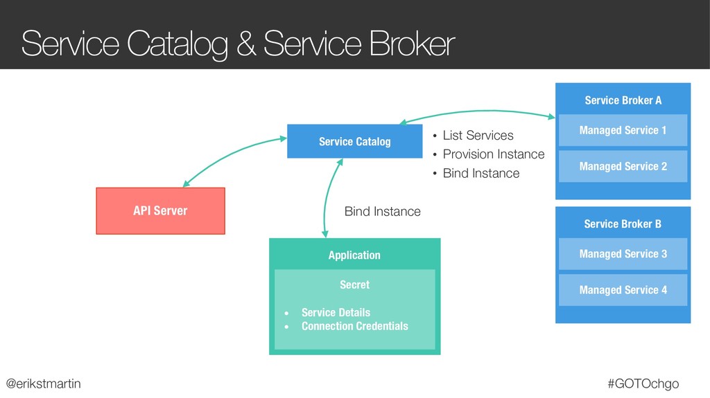 Catalog Service Broker A • List Services • Provision Instance • Bind Instance Managed Service 1 Managed Service 2 Service Broker B Managed Service 3 Managed Service 4 Application Bind Instance Secret • Service Details • Connection Credentials