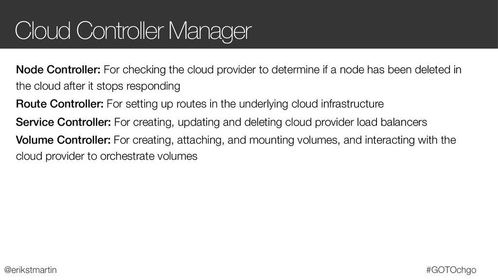 cloud provider to determine if a node has been deleted in the cloud after it stops responding Route Controller: For setting up routes in the underlying cloud infrastructure Service Controller: For creating, updating and deleting cloud provider load balancers Volume Controller: For creating, attaching, and mounting volumes, and interacting with the cloud provider to orchestrate volumes
