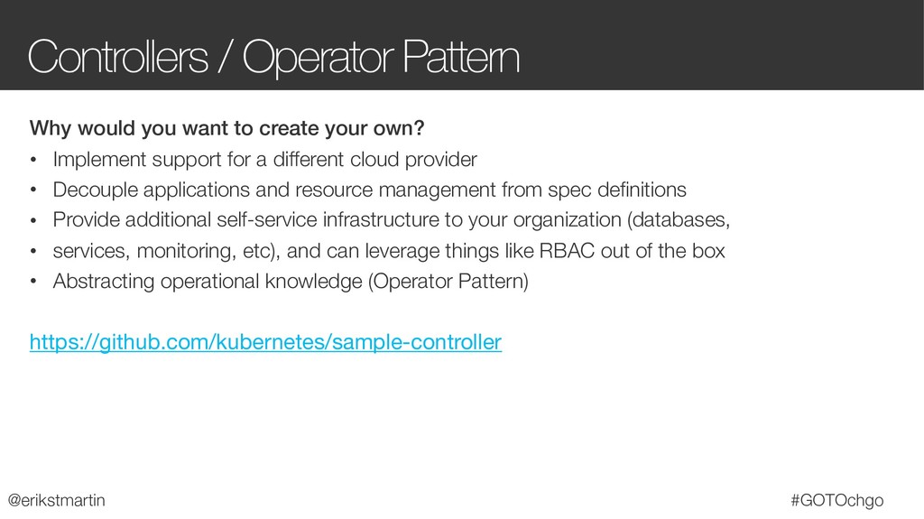 to create your own? • Implement support for a different cloud provider • Decouple applications and resource management from spec definitions • Provide additional self-service infrastructure to your organization (databases, • services, monitoring, etc), and can leverage things like RBAC out of the box • Abstracting operational knowledge (Operator Pattern) https://github.com/kubernetes/sample-controller