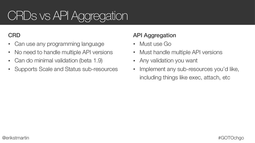 any programming language • No need to handle multiple API versions • Can do minimal validation (beta 1.9) • Supports Scale and Status sub-resources API Aggregation • Must use Go • Must handle multiple API versions • Any validation you want • Implement any sub-resources you’d like, including things like exec, attach, etc