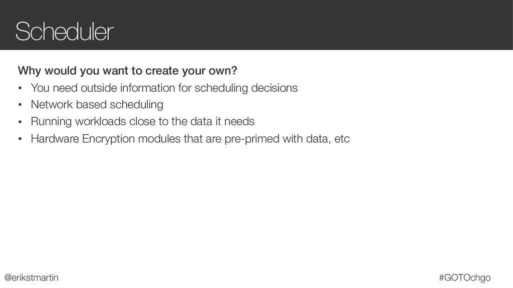 own? • You need outside information for scheduling decisions • Network based scheduling • Running workloads close to the data it needs • Hardware Encryption modules that are pre-primed with data, etc