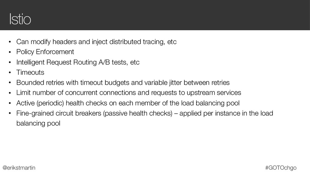 tracing, etc • Policy Enforcement • Intelligent Request Routing A/B tests, etc • Timeouts • Bounded retries with timeout budgets and variable jitter between retries • Limit number of concurrent connections and requests to upstream services • Active (periodic) health checks on each member of the load balancing pool • Fine-grained circuit breakers (passive health checks) – applied per instance in the load balancing pool