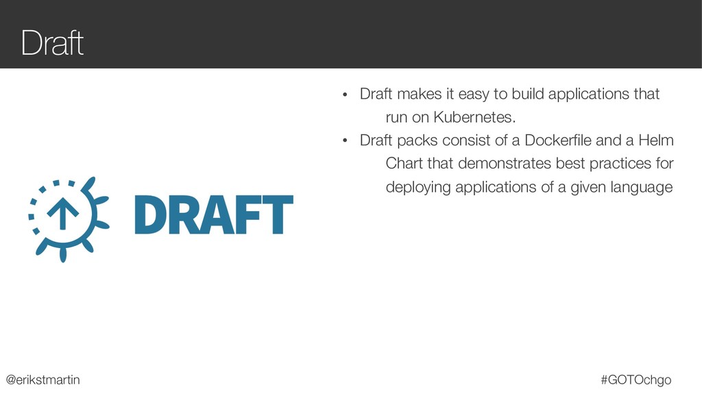 applications that run on Kubernetes. • Draft packs consist of a Dockerfile and a Helm Chart that demonstrates best practices for deploying applications of a given language