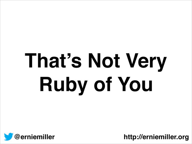 How Ruby is your Ruby? As we've found our way to Ruby, we've all brought with us habits and idioms from the languages we know and love (or hate). Sometimes, these habits serve us well, and other times, they make our lives more difficult. More often, they make life difficult for our collaborators, who don't expect to see C, Java, or PHP in their Ruby codebase.