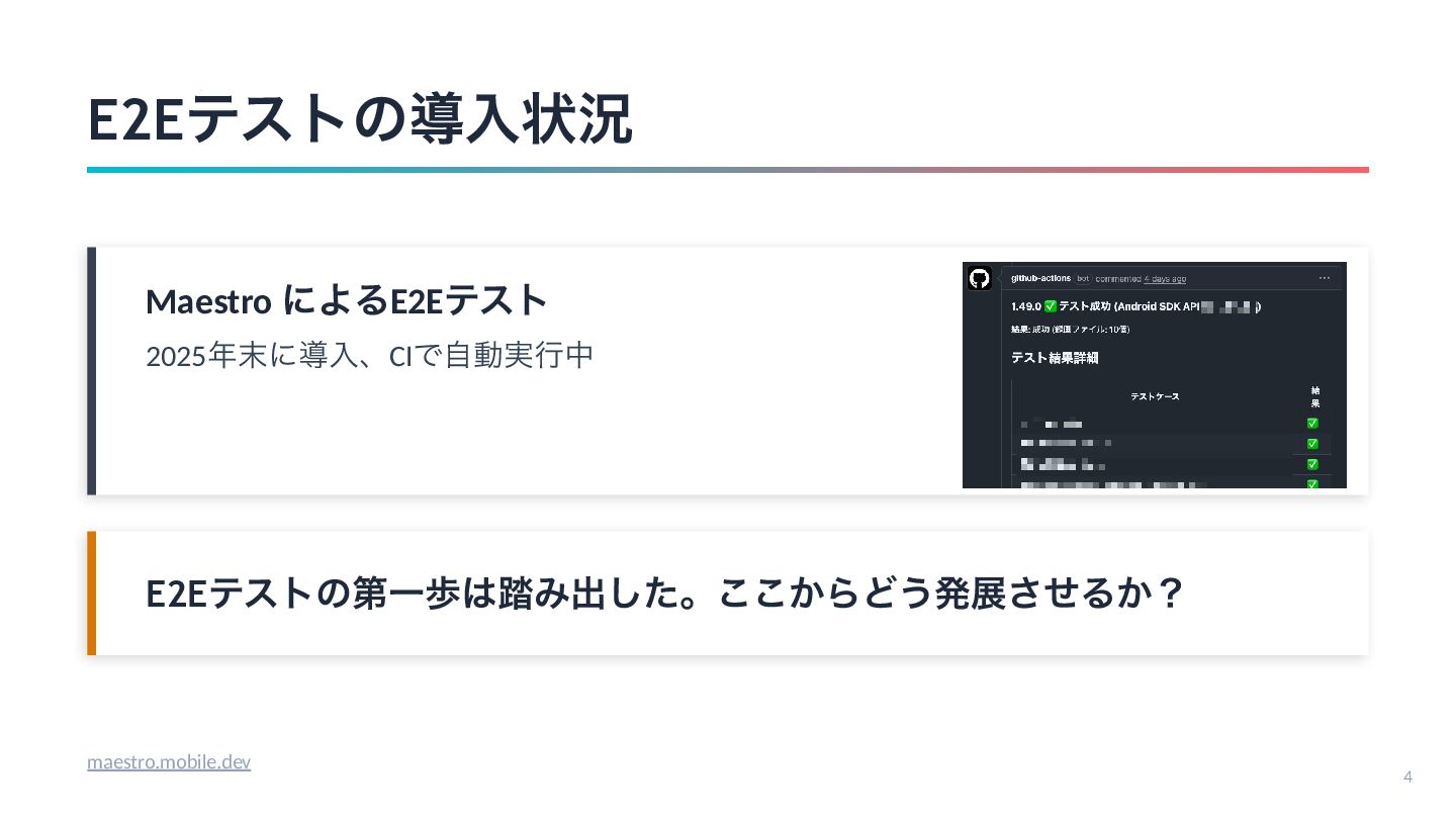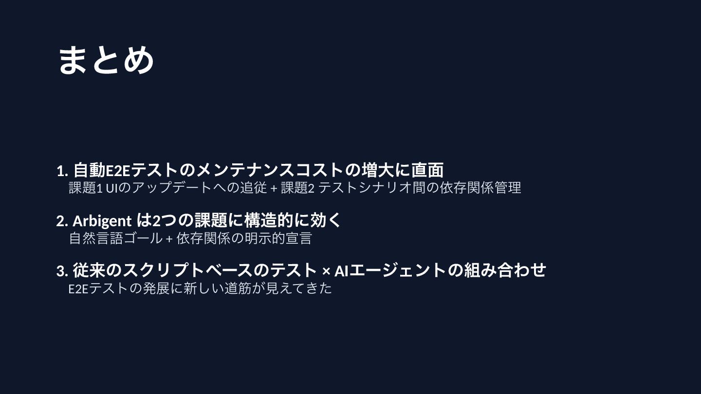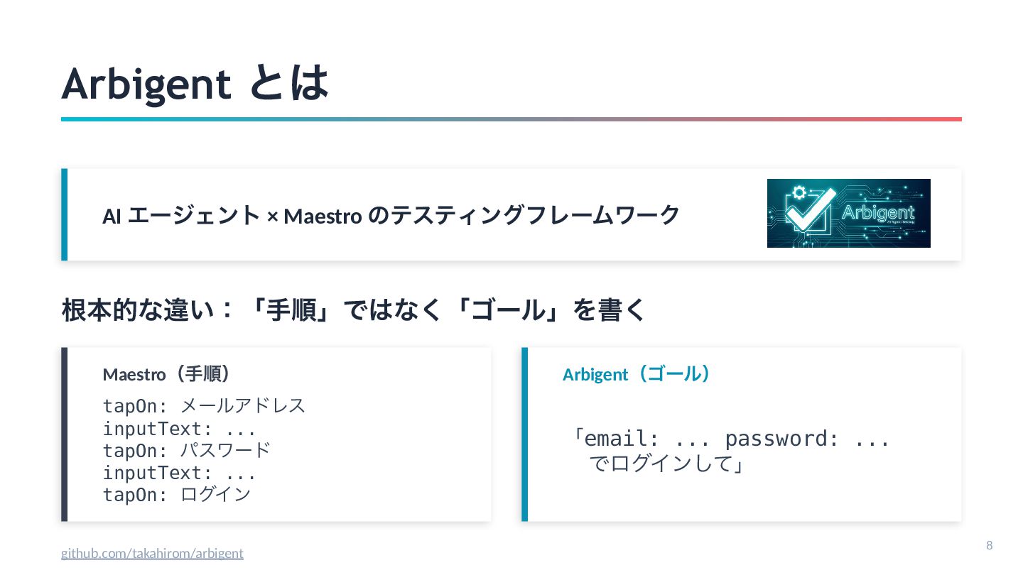 Maestro によるE2Eテストを運用する中で、テストシナリオの拡充に伴ってメンテナンスコストが跳ね上がる問題にぶつかりました。その解決策として、AIエージェントを活用するテスティングフレームワーク Arbigent を実際に試した結果を共有し、テストシナリオの特性に応じた使い分けの考え方を紹介します。
