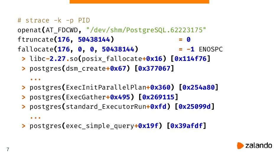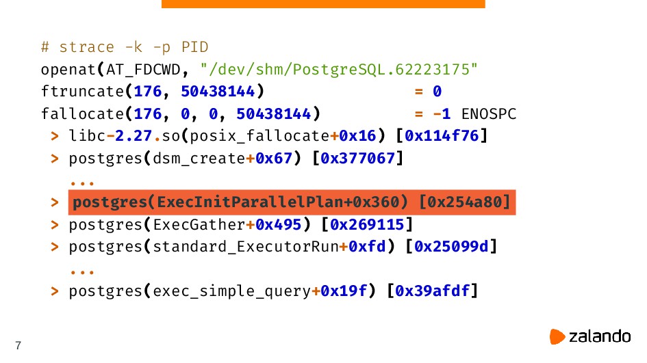 0 fallocate(176, 0, 0, 50438144) = -1 ENOSPC > libc-2.27.so(posix_fallocate+0x16) [0x114f76] > postgres(dsm_create+0x67) [0x377067] ... > postgres(ExecInitParallelPlan+0x360) [0x254a80] > postgres(ExecGather+0x495) [0x269115] > postgres(standard_ExecutorRun+0xfd) [0x25099d] ... > postgres(exec_simple_query+0x19f) [0x39afdf] 7