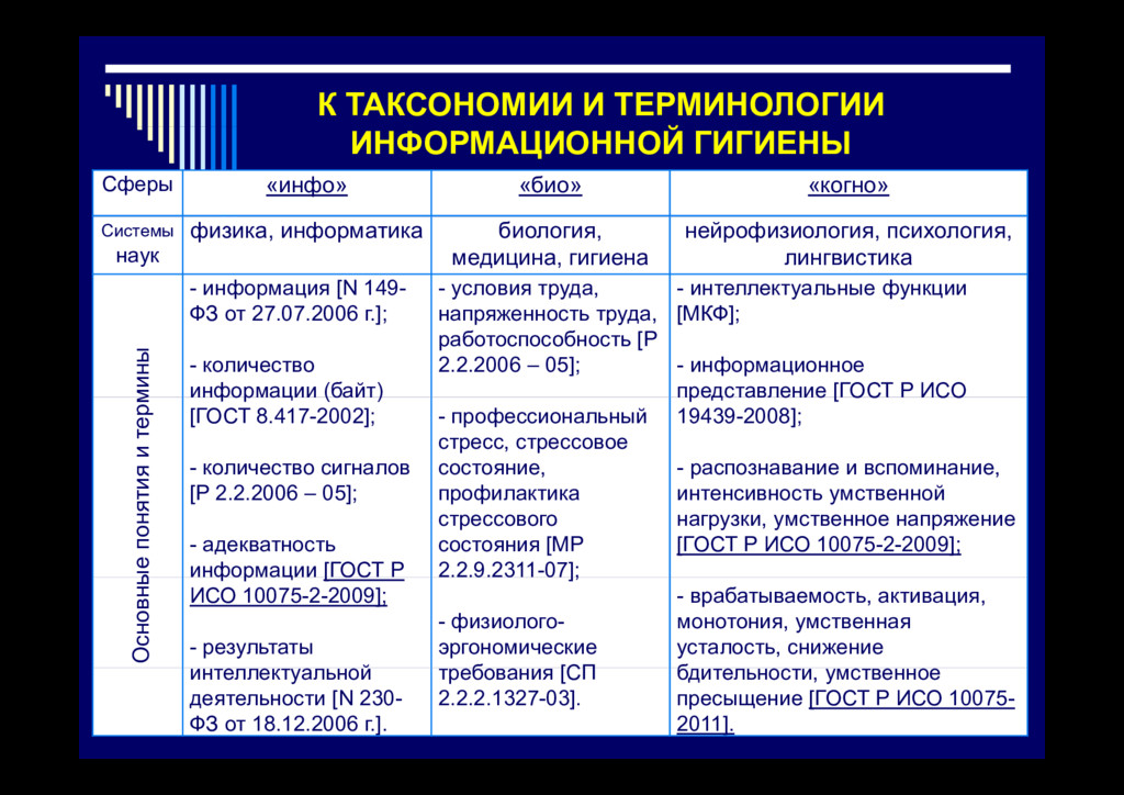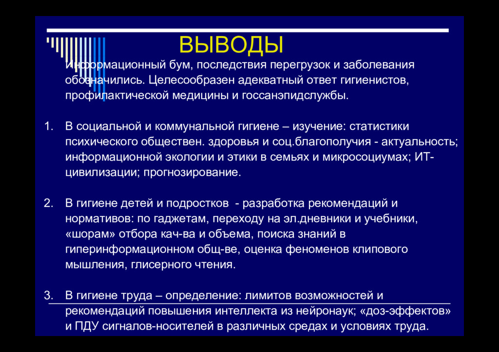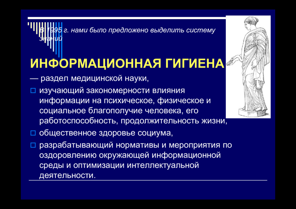 Аспекты окружающей среды, человека и общества Разделы профилактической медицины Особенности региона Общая гигиена, токсикология, микробиология, Особе ос ре о а проживания Обща е а, о с о о , роб о о , эпидемиология и др. (климатогеографические особенности, воздух, вода, почва, растительный и животный мир и др.) Н К Населенные места и места общего пользования Коммунальная гигиена, радиационная гигиена, информационная гигиена и др. Индивидуум, развитие Гигиена личная, половая, питания, детей и подростков, д дуу , р личности , , , д др , информационная гигиена и др. Труд и творческая деятельность Гигиена труда (физиология труда, эргономика и т.п.), авиакосмическая, военно-морская, судовая, транспортная, , р , у , р р , радиационная, информационная гигиена и др. Социум и социальные факторы Социальная гигиена, социальная психология, информационная гигиена (СМИ, экономика, внутренние и международные отношения и др ) общественное здоровье международные отношения и др.), общественное здоровье и организация здравоохранения