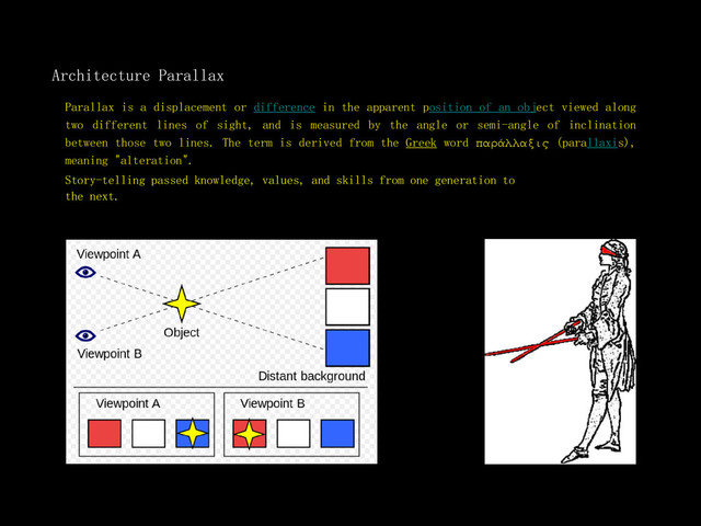 the next. Parallax is a displacement or difference in the apparent position of an object viewed along two different lines of sight, and is measured by the angle or semi-angle of inclination between those two lines. The term is derived from the Greek word παράλλαξις (parallaxis), meaning "alteration". Architecture Parallax